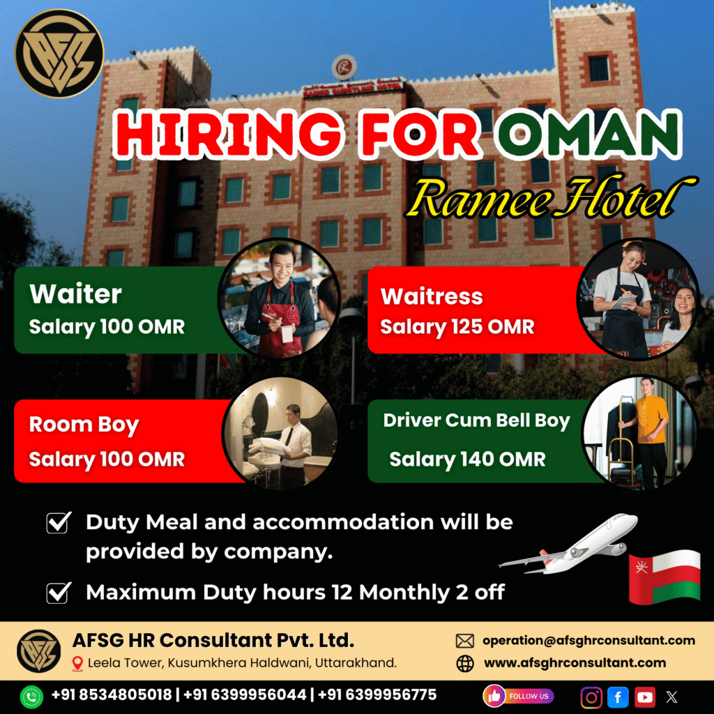 If you’re searching for a trusted and verified Gulf Jobs Consultancy or a Best Manpower Agency that provides legal overseas job placements, then this opportunity is perfect for you. AFSG HR Consultant Pvt. Ltd., one of the leading Overseas Recruitment Agencies in India, is hiring candidates for Ramee Hotel in Oman with attractive salary packages and employer-provided benefits.
