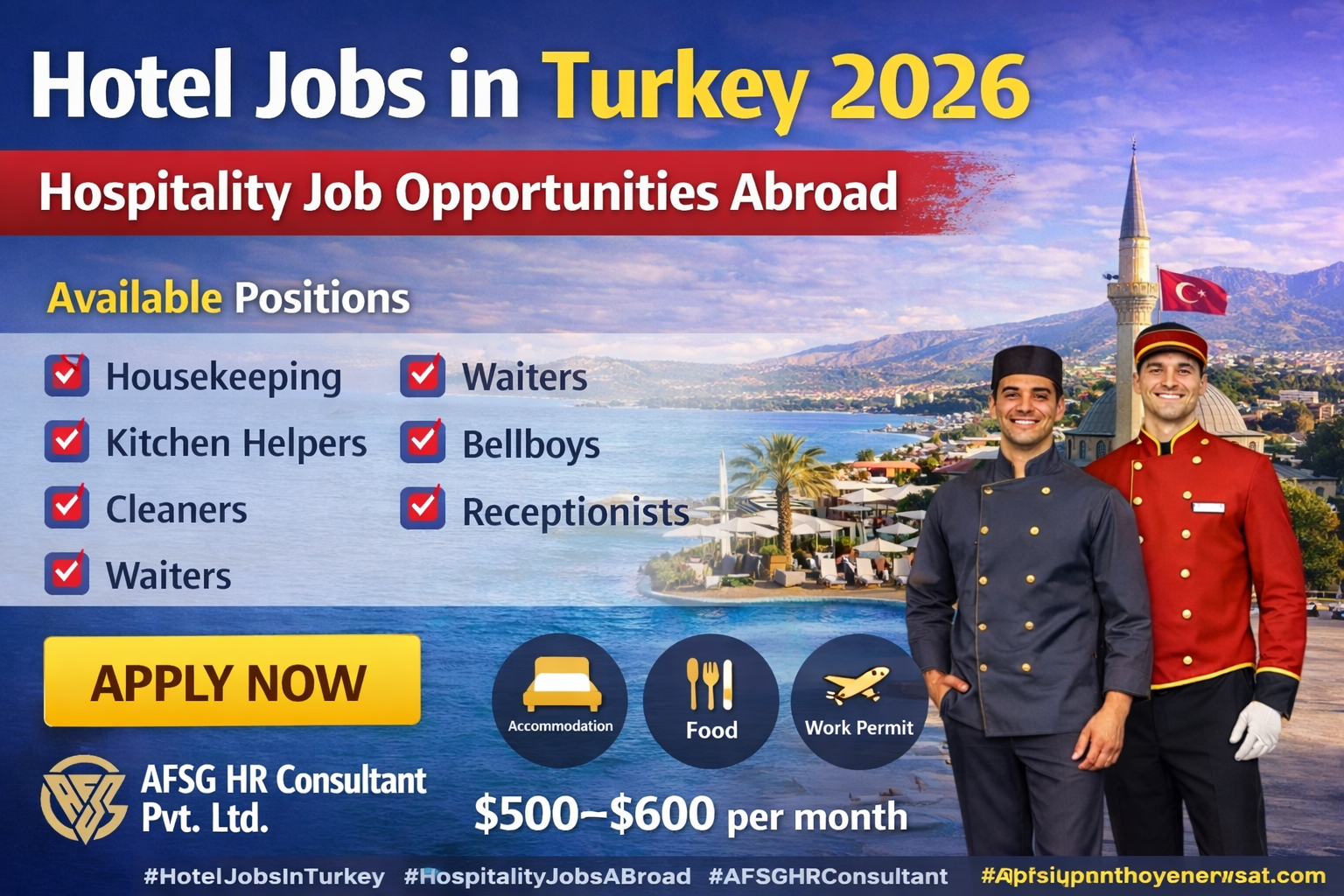 Through AFSG HR Consultant Pvt. Ltd., candidates can apply for various hotel positions in Turkey with attractive benefits and a stable work environment. Candidates with certification and a minimum of two years of experience are encouraged to apply.