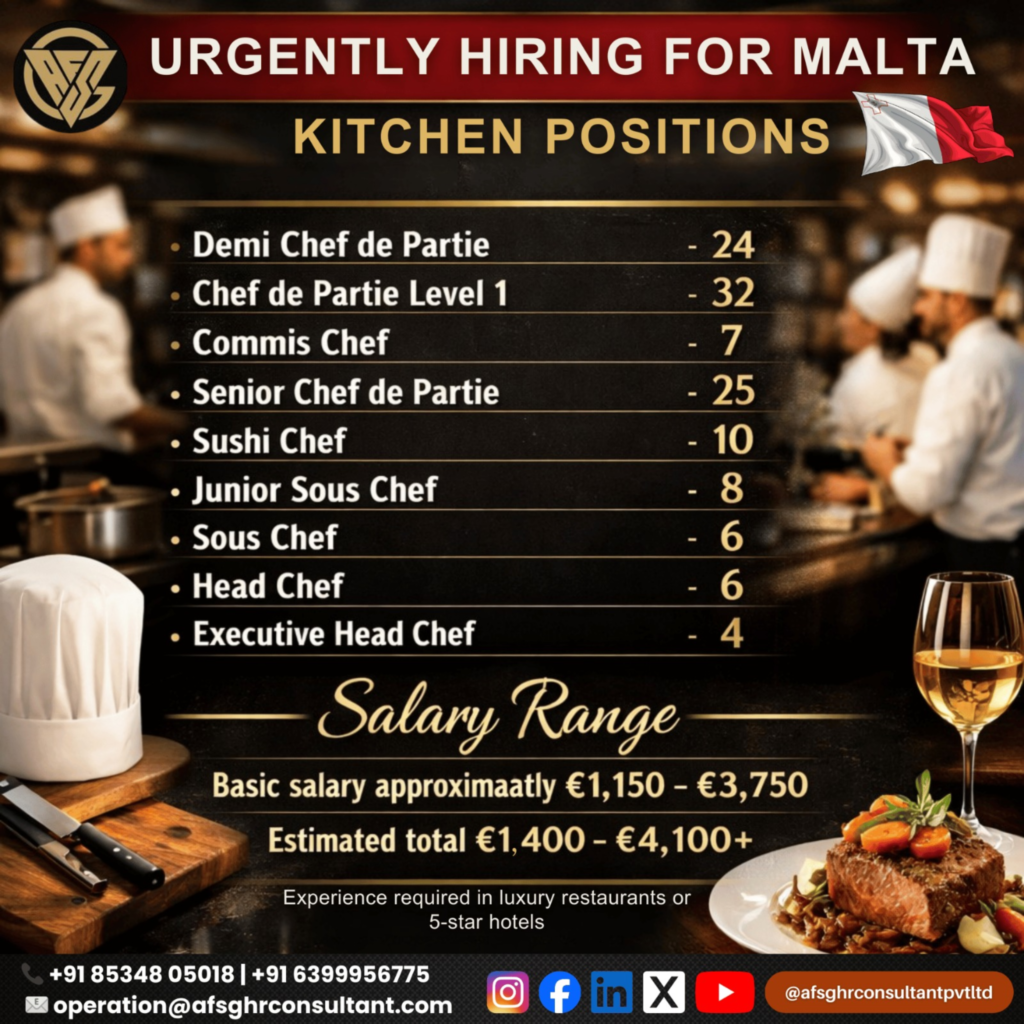 The hospitality industry in Malta is growing rapidly, creating high demand for skilled chefs and kitchen professionals. Luxury restaurants and 5-star hotels in Malta are currently hiring experienced kitchen staff from international markets.