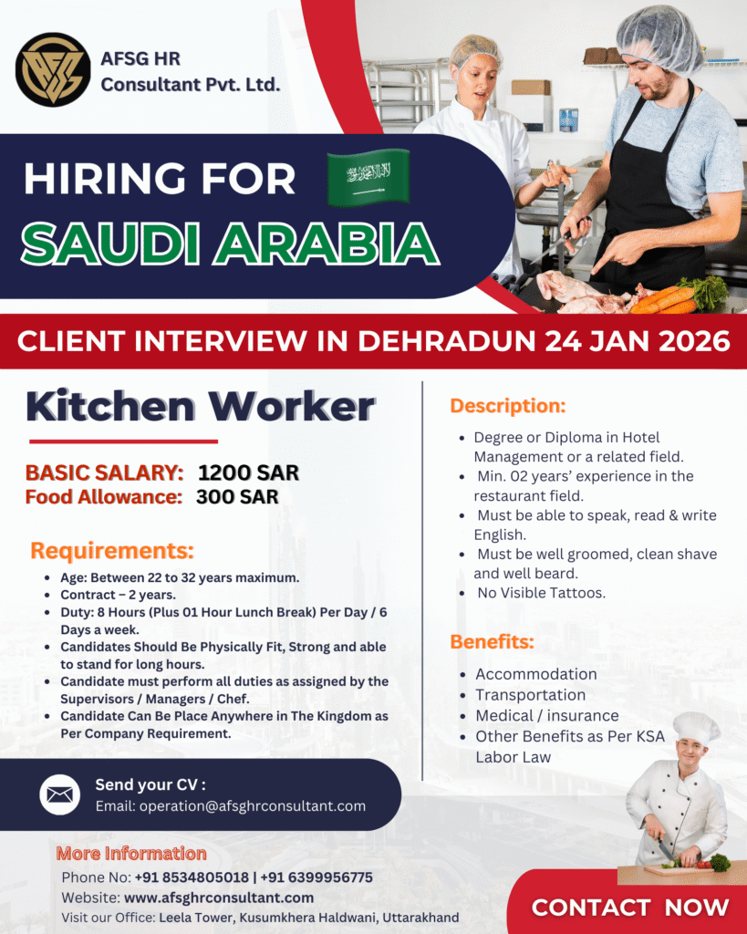 Saudi Arabia has become one of the most popular destinations for Indian hospitality professionals. Among the most in-demand roles, Kitchen Worker jobs in Saudi Arabia offer stable income, international exposure, and long-term career growth. If you are looking to build a secure future in the Gulf hospitality sector, this opportunity is ideal for you.
