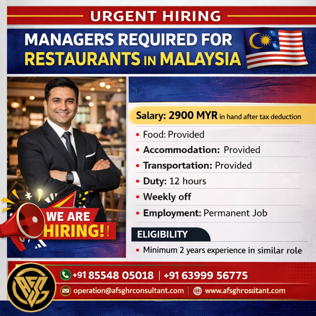 AFSG HR Consultant Pvt. Ltd. is urgently hiring Restaurant Managers for Malaysia for reputed restaurant establishments. This is a permanent overseas job with attractive salary and free facilities.