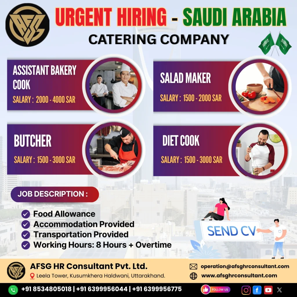 AFSG HR Consultant Pvt. Ltd. brings you Saudi Arabia Catering Company Jobs Jobs with top benefits and excellent growth prospects. This is your chance to build an international career in one of the Gulf’s most reputed catering companies.